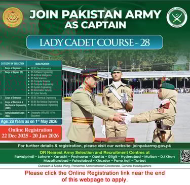 Join Pakistan Army as Captain December 2025 / 2026 through Lady Cadet Course Online Registration